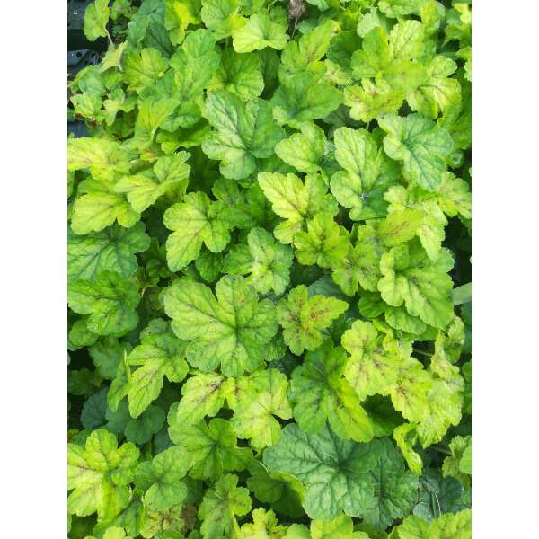 Tiarella cordifolia 'Running Tiger' vormt een pol van groene bladeren met een paarsbruin onregelmatig gevlekt centrum.
