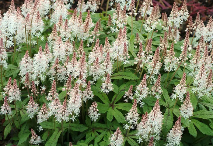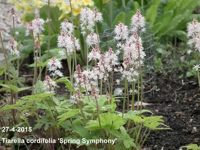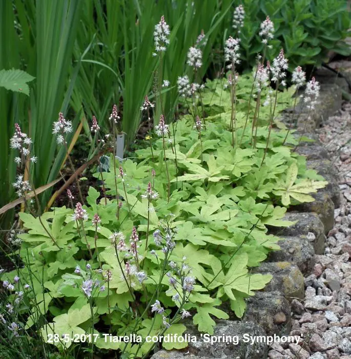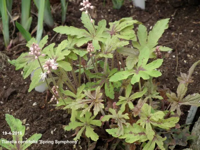Tiarella 'Spring Symphony' is een een mooie compacte bodembedekker. Het blad is groen met bruinrode nerven.