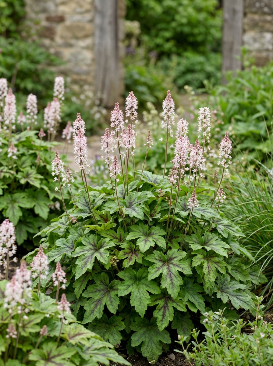 Tiarella 'Sugar and Spice' is een vaste plant met rozetten van eivormige, glanzende, diep gelobde, groene bladeren met kastanjebruine tot bijna zwarte nerven en rechtopstaande trossen van pluizige, witte bloemen uit roze knoppen.