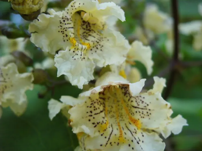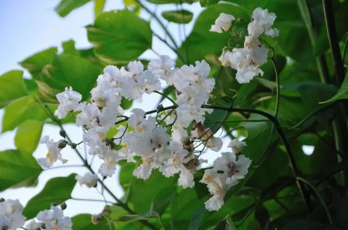 Oudere exemplaren bloeien met grote trompetvormige bloemen, waar later in de herfst grote zaadpeulen verschijnen.