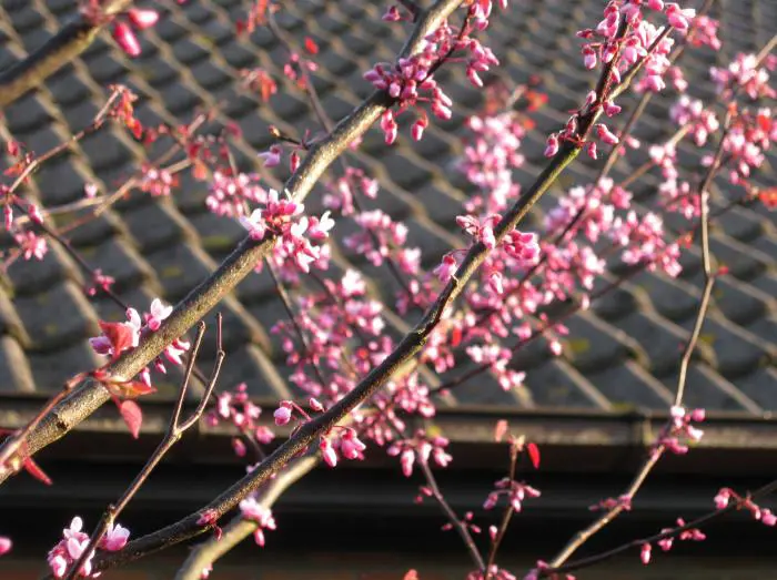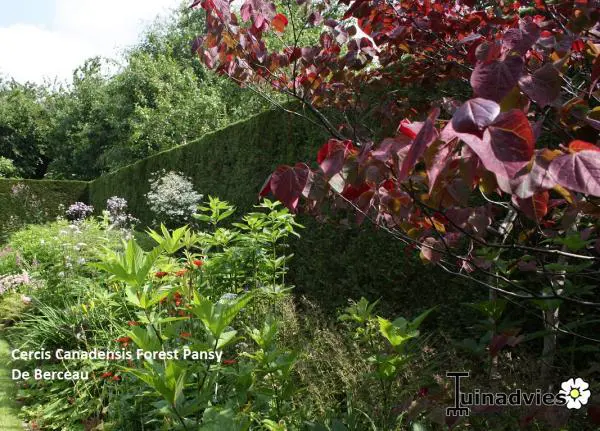 Cercis canadensis 'Forest Pansy' is een vaak meerstammige, hoge heester/kleine boom (H.3m) met zeer aantrekkelijke, brede hartvormige bladeren en met een prachtige verkleuring door de seizoenen heen. In het voorjaar violetpurper, in de zomer lichtgroen om dan in het najaar te eindigen met rood.