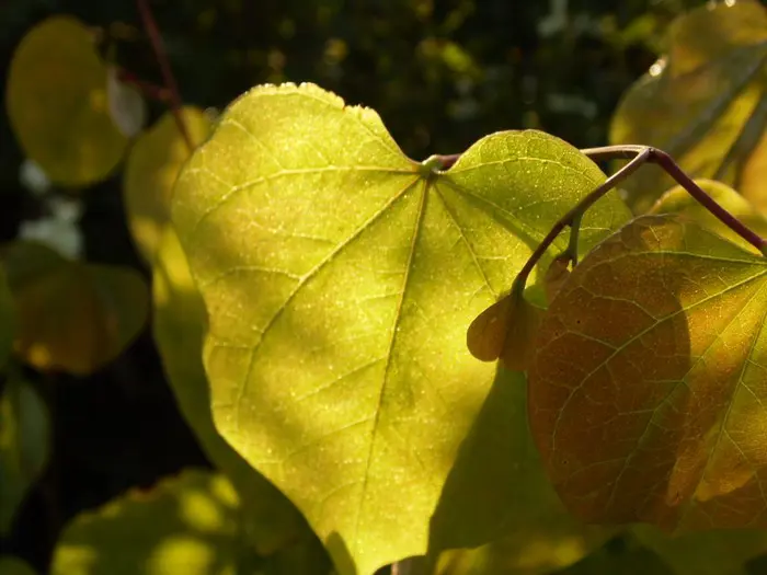 Het blad is hartvormig met een prachtige verkleuring door de seizoenen heen. In het voorjaar bronskleurige, in de zomer groen om dan in het najaar te eindigen met geel.