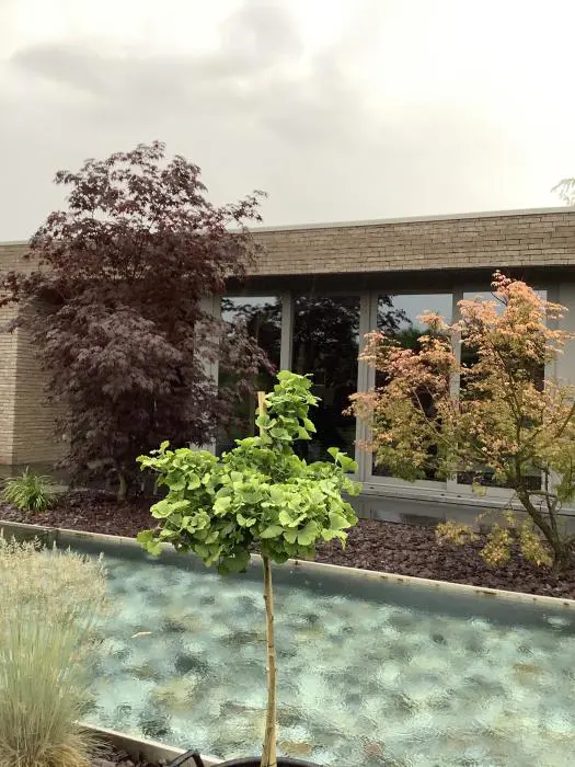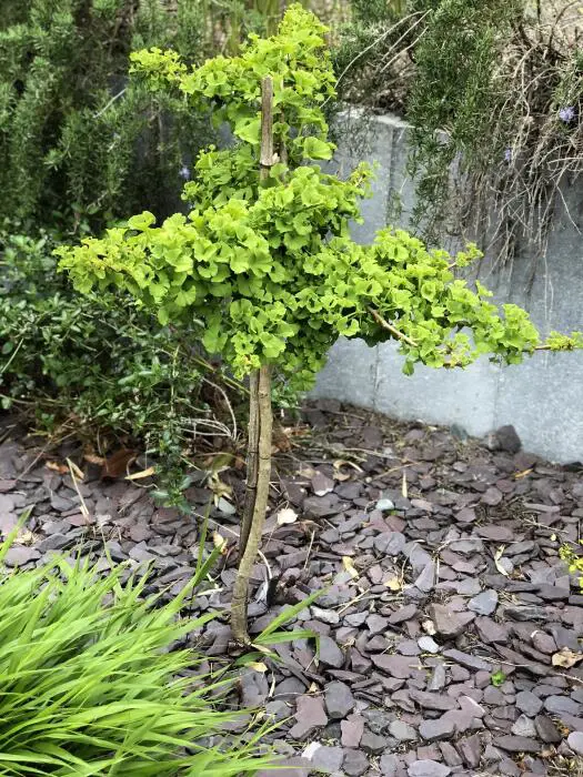 Ginkgo biloba 'Troll' is een dwergvorm met korte takken en frisgroene bladeren.Het blad heeft een typische waaiervorm en verkleurt in de herfst naar prachtig geel.