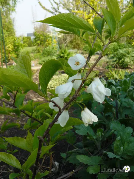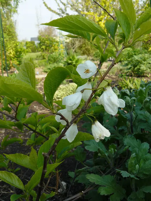Halesia carolina is een hoge heester/kleine boom met groen blad en een grijs behaard onderkant dat in het najaar mooi geel verkleurt.