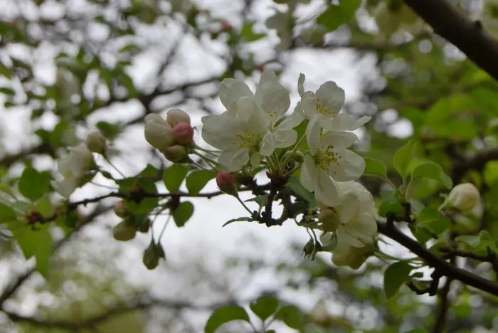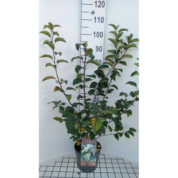 Malus ‘Evereste’ heeft een half open, pyramidale kroon en bloeit met roze/witte appelbloesems, de appeltjes zijn rood/oranje.