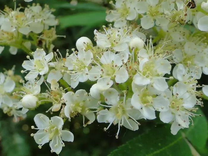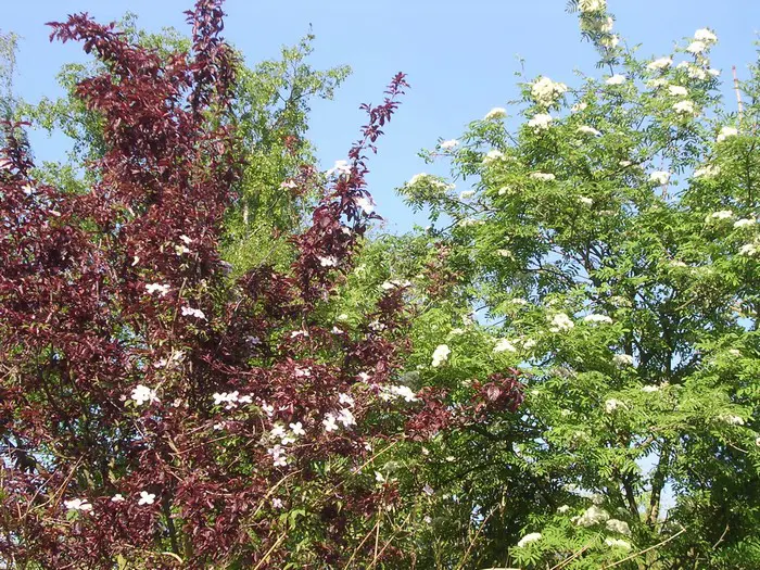 In mei /juni verschijnen de vuilwitte platte schermachtige bloemen, veel sierwaarde hebben ze trouwens niet.