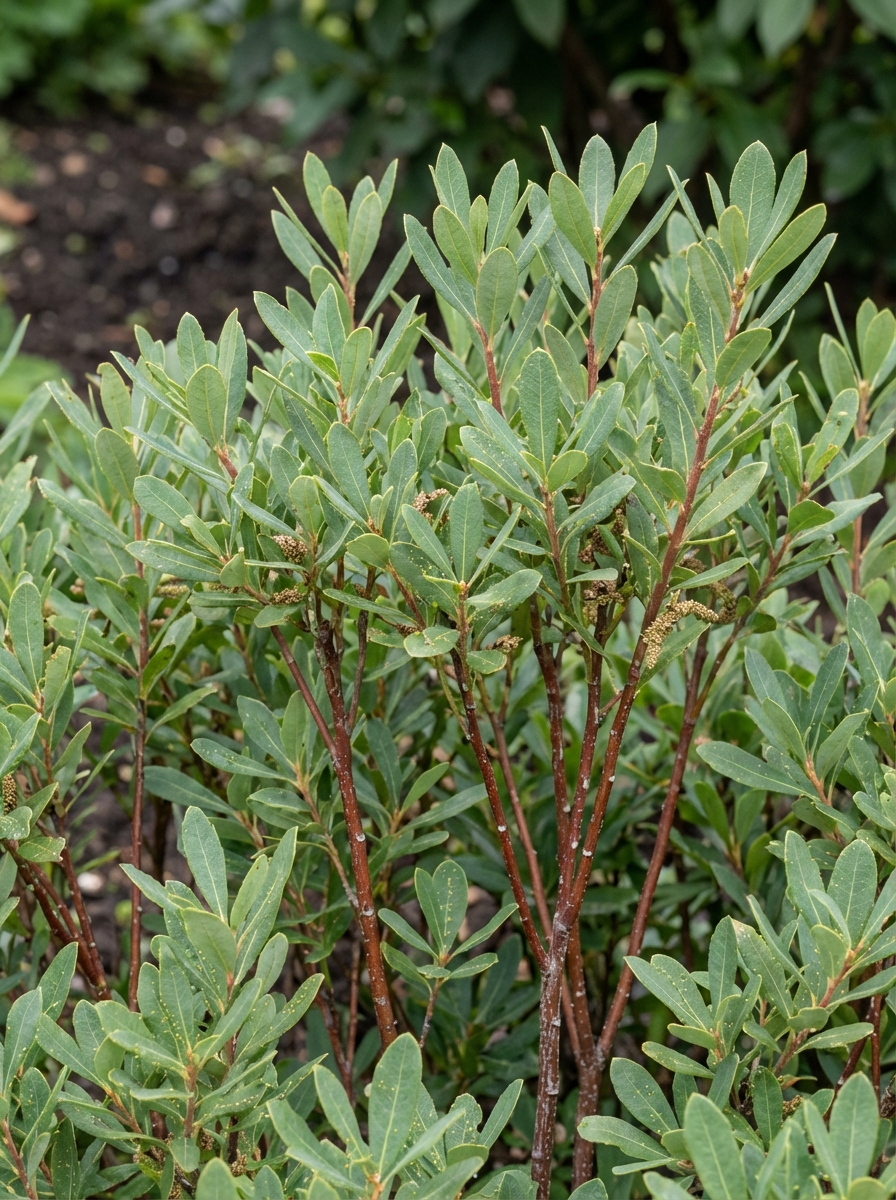 Mannelijke struiken zijn te herkennen aan de grote goudbruine katjes terwijl de vrouwelijke half zo klein zijn en bleker.