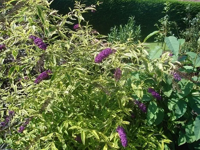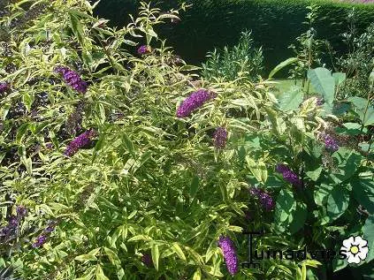 Buddleja davidii 'Santana' is een vlinderstruik met geelgroen bonte bladeren en lilapaars bloempluimen.