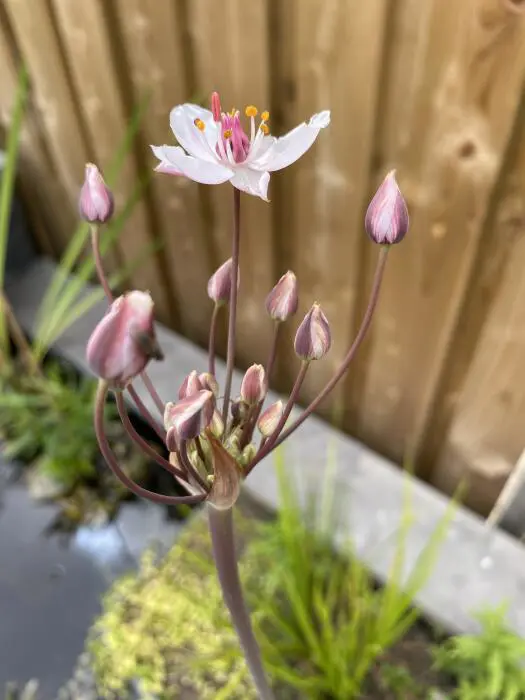 De lichtroze bloemen bloeien schermvormig met een donker hartje.