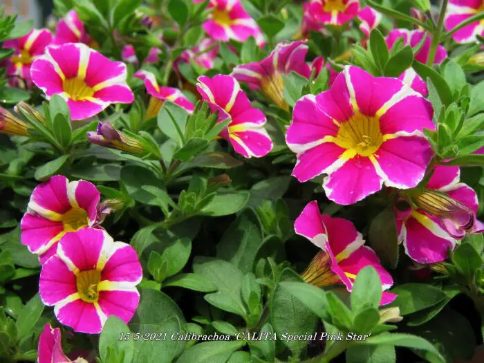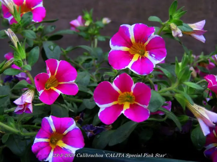 Calibrachoa 'Calita Special Pink Star' heeft een matig hangende groeiwijze en bloeit paarsroze met 5 witte strepen en geel in de keel.