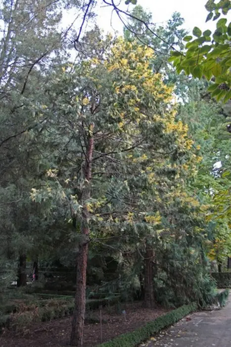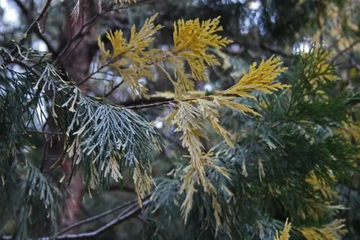 Calocedrus decurrens 'Aureovariegata' is zuilvormig.