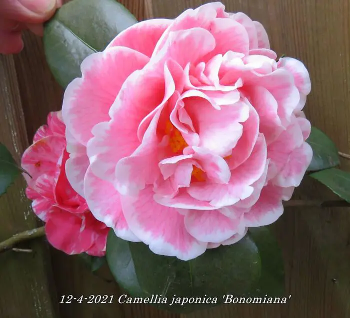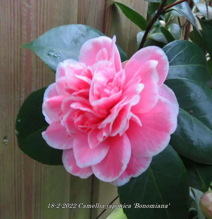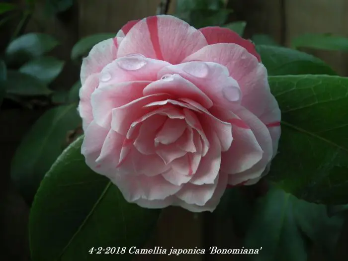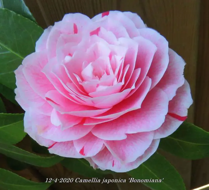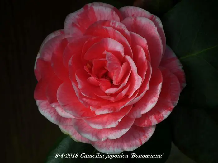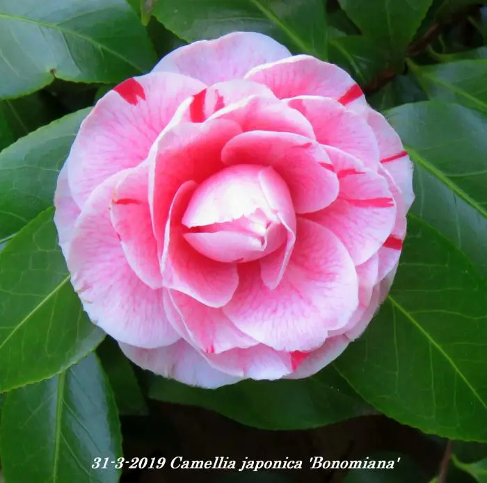 Camellia japonica 'Bonomiana' heeft grote gevulde bloemen, wit/roze met karmijnrode strepen.
