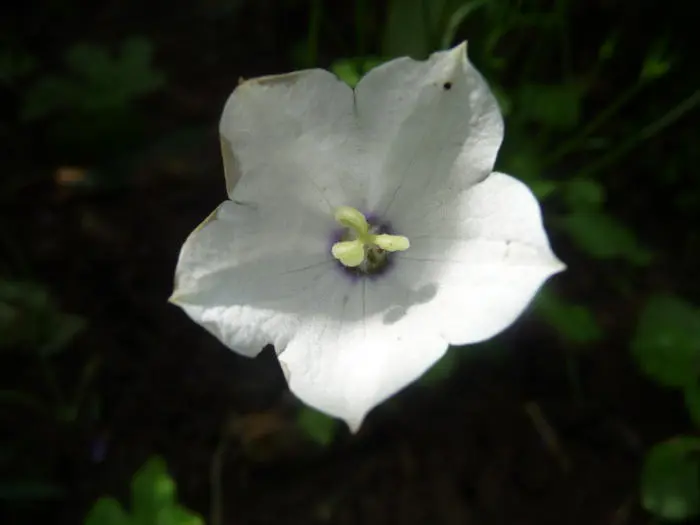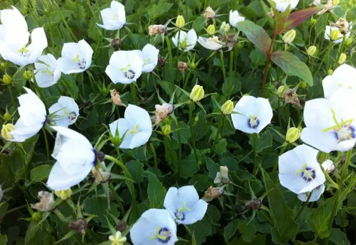 Campanula 'Jenny' is een hybride met afgeplatte klokvormige witte bloemen, mooi is het blauw oogje in het centrum.