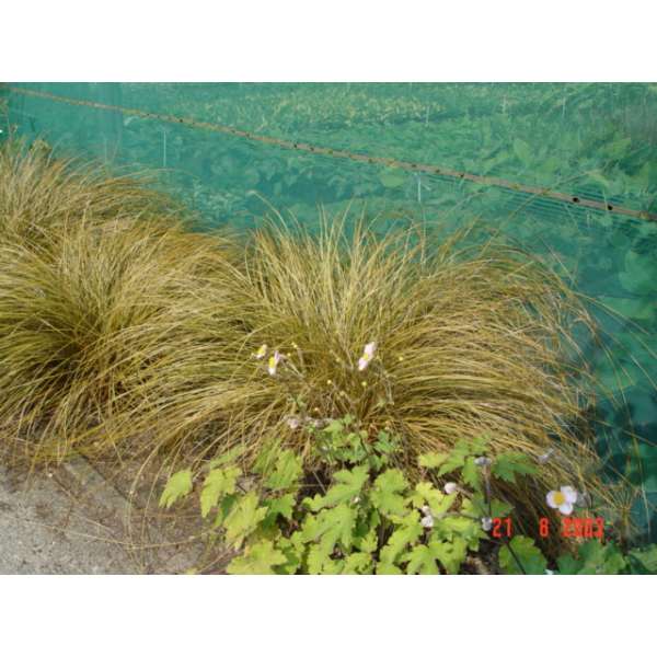 Lage siergrassen met overhangende beigekleurige/bronsgroene bladeren.