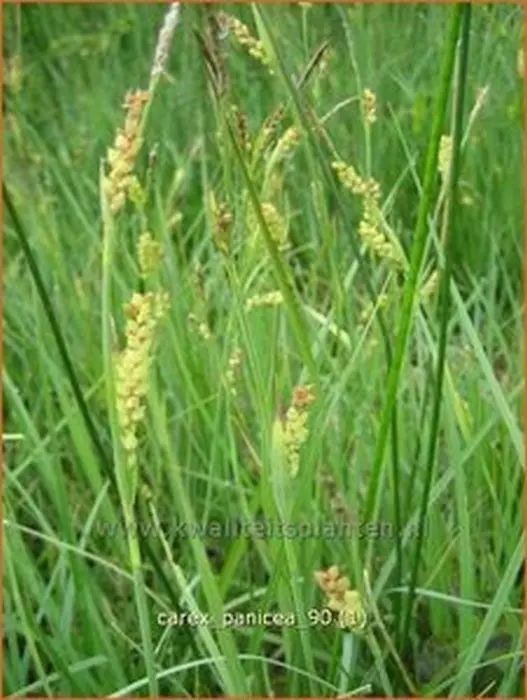 Carex panicea vormt een pol van overhangende smalle grasachtige bladeren, glanzend en blauwgroen van kleur.