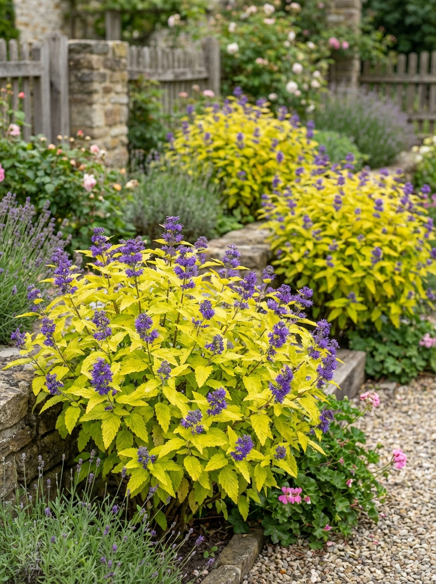 vormt een opgaande, bossige vertakte struik met lancetvormige, goudgele bladeren die niet verbranden in de volle zon. In meer schaduw wordt het blad groener. Bij het kneuzen van het blad komt er een muntgeur vrij.