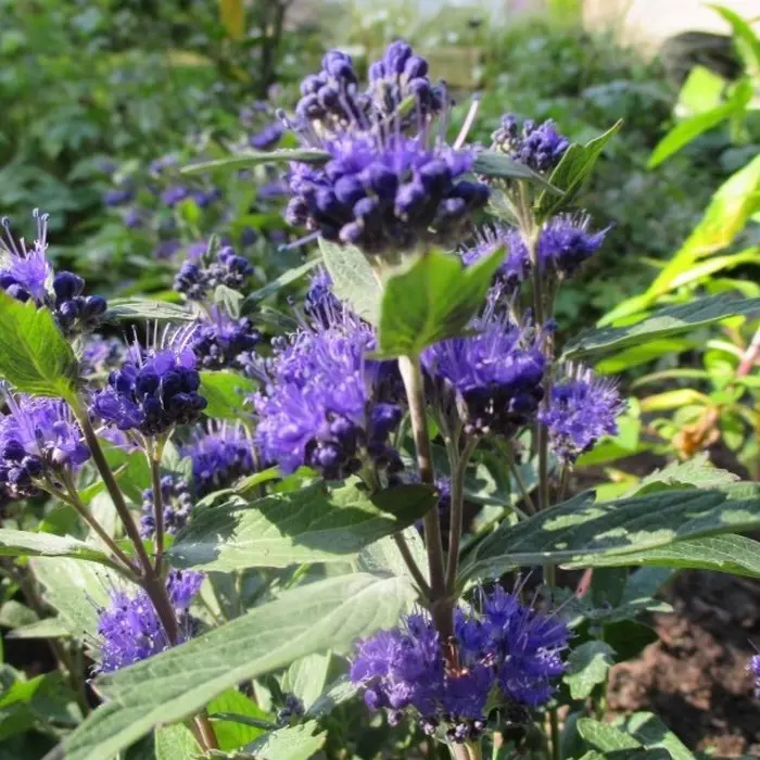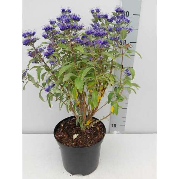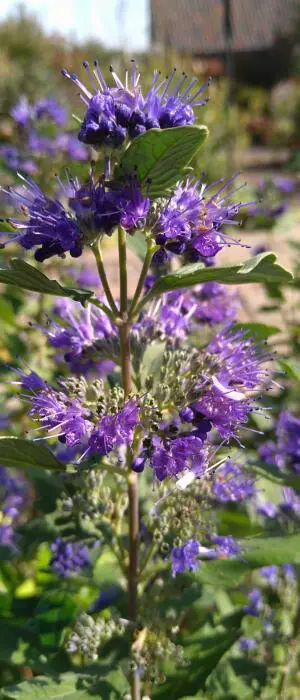 Bloeit met zoetgeurende diepblauwe, pluizige bloempluimen met lange meeldraden.