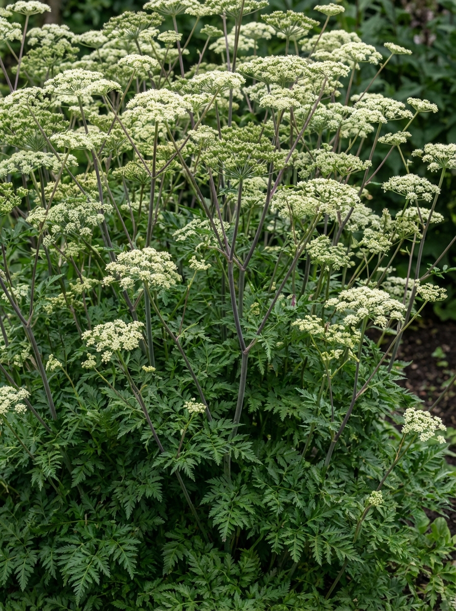 Cenolophium denudatum is vooral mooi door haar fijne structuur en kantachtige roomwitte schermbloemen.