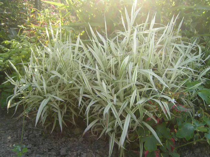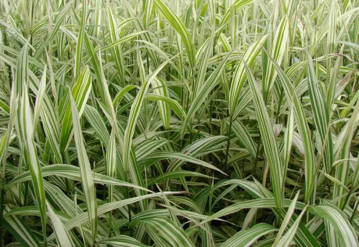 De bamboeachtige bladeren zijn felgroen en roomwit gestreept.