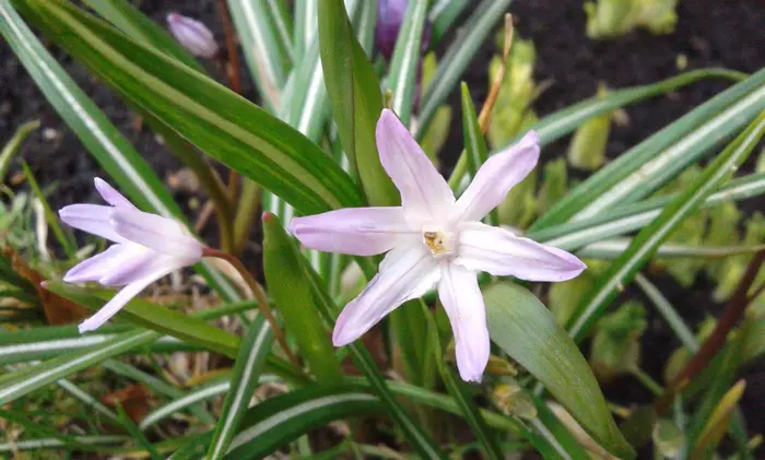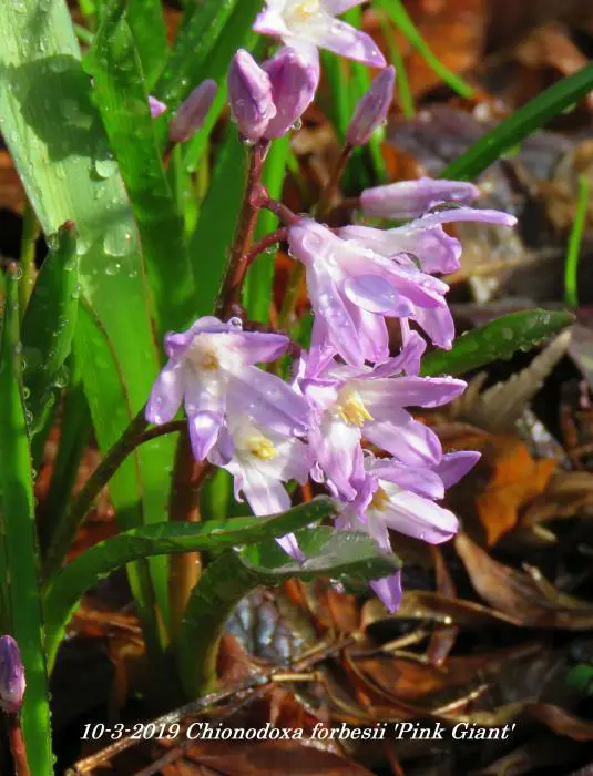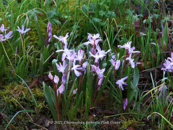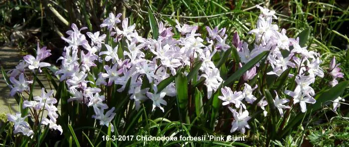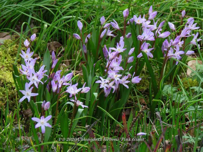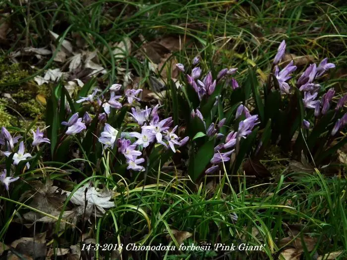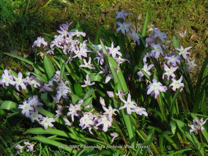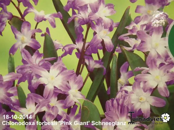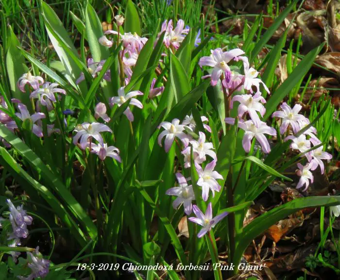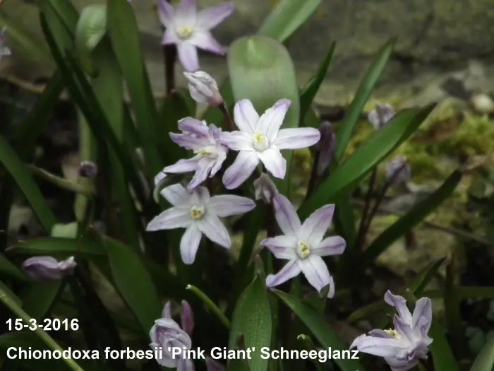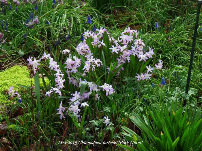 Chionodoxa forbesii 'Pink Giant' bloeit in het vroege voorjaar met mooie kleine stervormige zachtroze bloemen met een wit hartje.