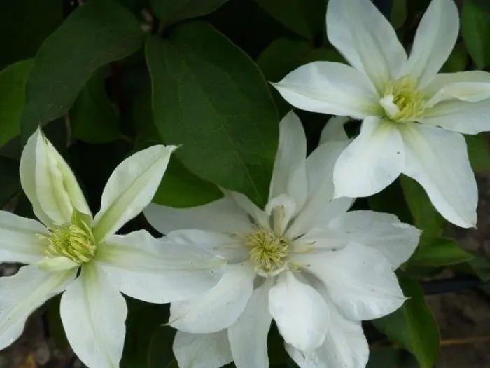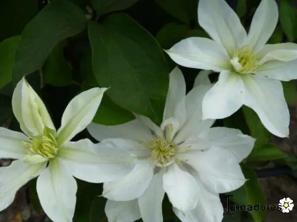 Clematis 'Baby Star' bloeit eerst met dubbele witte bloemen die later enkel zijn. In het midden van de bloemblaadjes loopt er een groene middennerf.