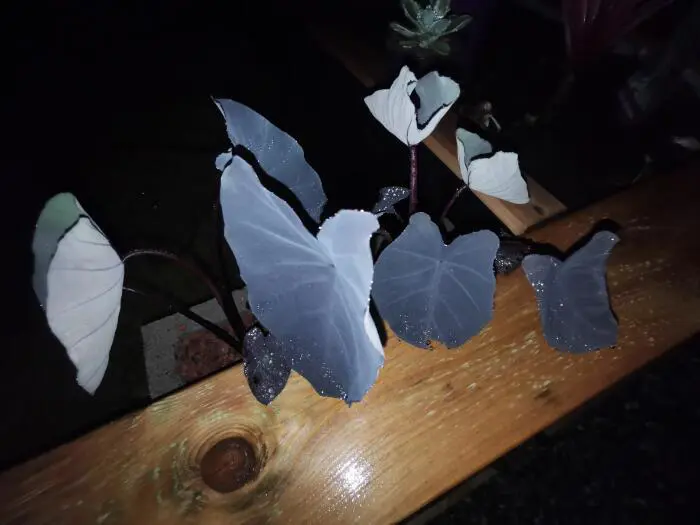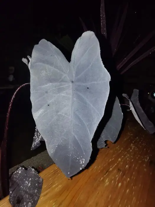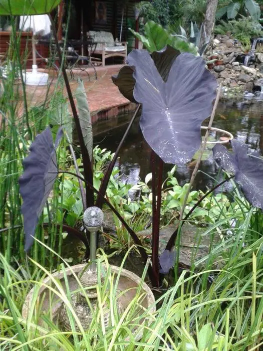Het is een opgaand groeiende plant met lange bordeauxpaarse stengels waaraan eerst de paarsgeaderde groene bladeren groeien die later naar paars, bijna zwart verkleuren. Achterkant van het blad is krijtachtig grijs. Echt prachtig als de zon door het blad schijnt en men dan de donkere nerven ziet. De pijlvormige bladeren zijn 50cm groot.