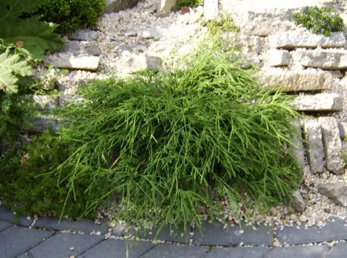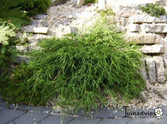 Chamaecyparis pisifera 'Filifera Nana' vormt een rond struikje met lange dunne afhangende twijgjes.