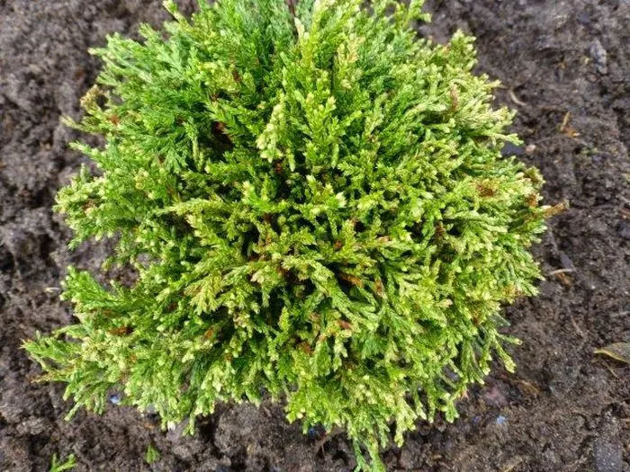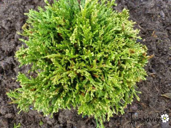 Chamaecyparis pisifera 'White Pygmy' is een dwergconifeer met plukjes grijsgroene bladeren waarvan de toppen wit zijn.