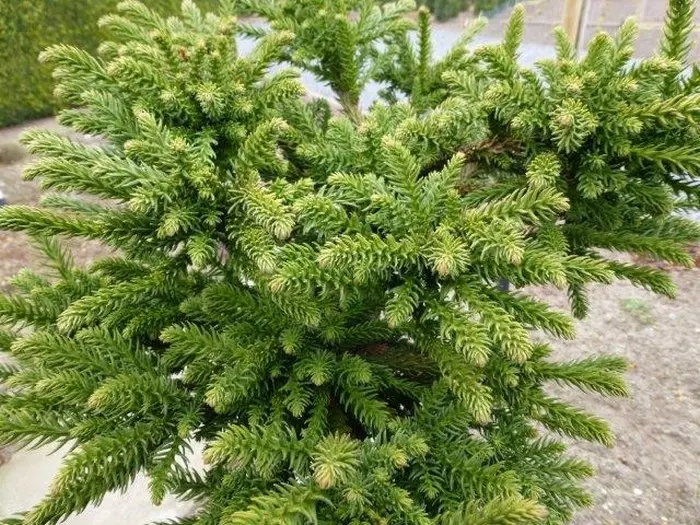 Cryptomeria japonica 'Dinger' heeft een opvallende en uitzonderlijke compacte bolvormige groei met staartvormige frisgroene takken. Aan de uiteinden worden weer nieuwe twijgen gevormd.