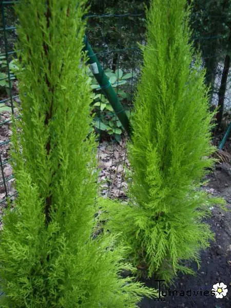 Cupressus macrocarpa ´Goldcrest´ is een limegele naaldboom met een conische vorm.