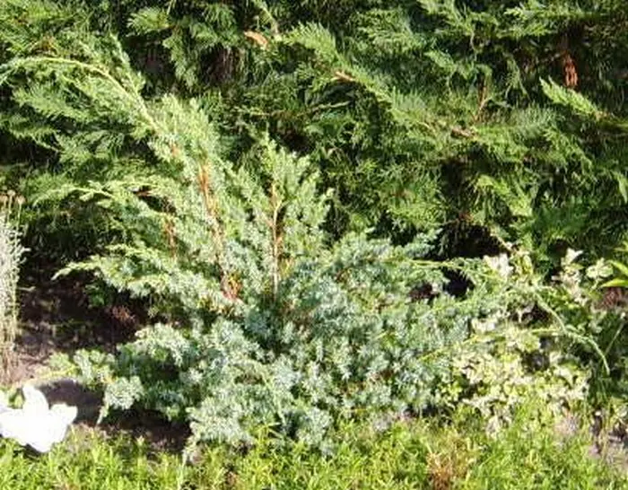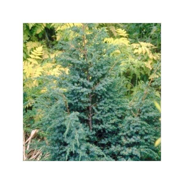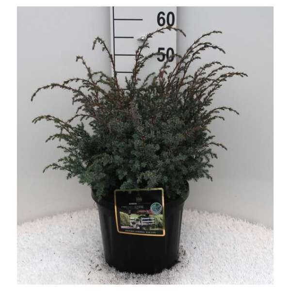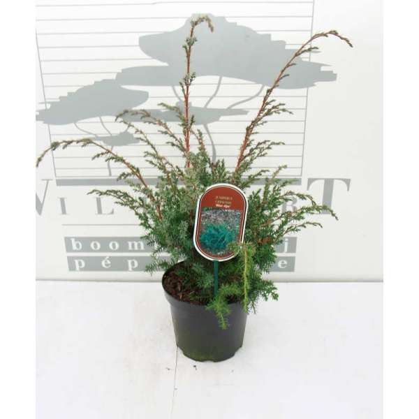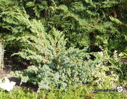 Juniperus chinensis ‘Blue Alps’ vormt een opgaande struik met overhangende twijgen.