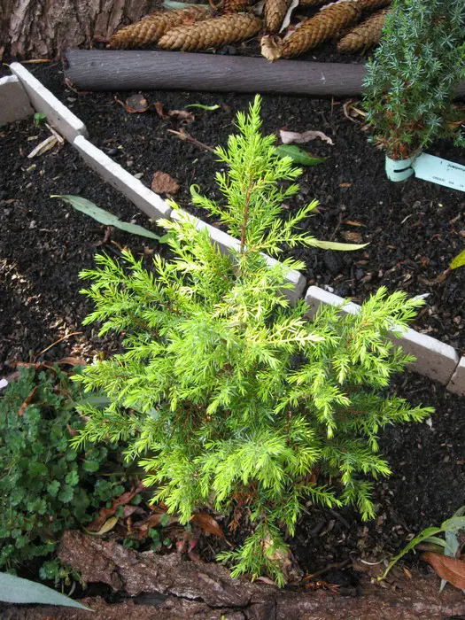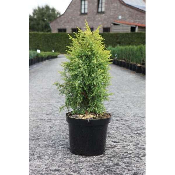 Juniperus communis 'Gold Cone' vormt een smalle zuilvormige conifeer met goudgele naalden.