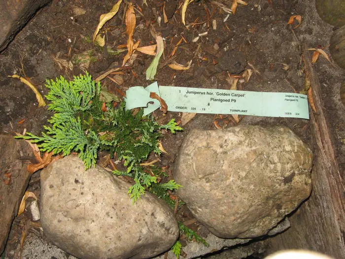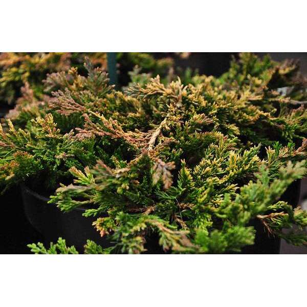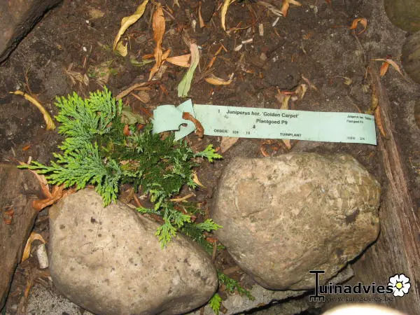 Juniperus horizontalis 'Golden Carpet' is een laagblijvende, kruipende bossige conifeer met goudgele kleine bladeren die een bronspaarse tint krijgen in de winter.
