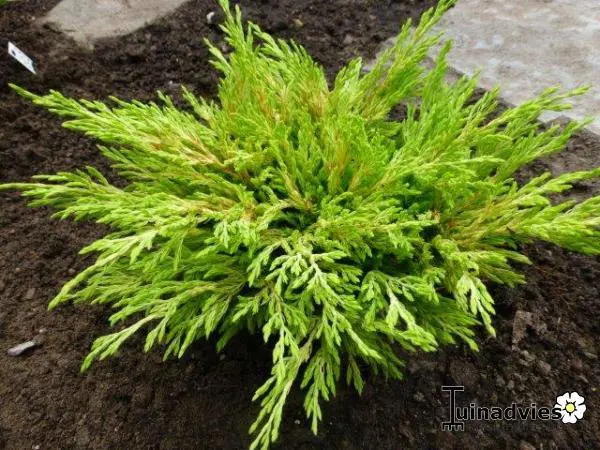 Juniperus horizontalis 'Limeglow' is een laagblijvende, kruipende bossige conifeer met geelgroen (limegroen) tot heldergele kleine bladeren die een bronspaarse tint krijgen in de winter.