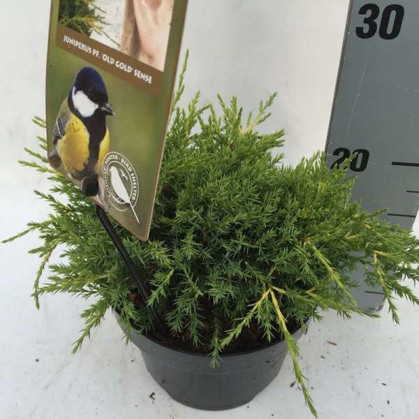 Juniperus pfitzeriana 'Old Gold' is een compacte vaasvormige conifeer met geelgroen tot goudgele naaldvormige bladeren die een bronsgoude kleur krijgt in de winter.