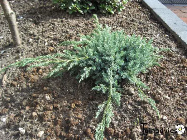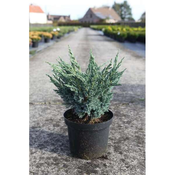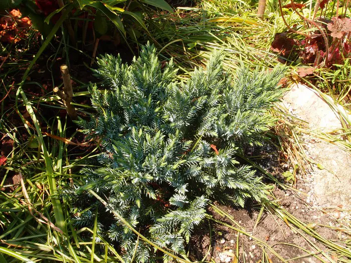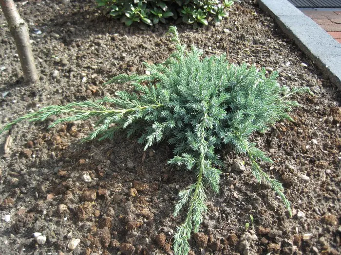 Juniperus squamata 'Blue Carpet' is een breedgroeiende bodembedekker met zilverblauwe kleur.