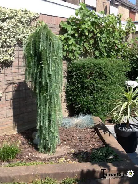 Larix kaempferi 'Stiff Weeper' heeft een strak hangende treurvorm.