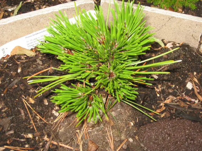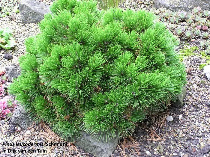 Pinus heldreichii 'Schmidtii' afkomstig uit Bosnië, is een compacte bolvormige dwergconifeer.Lange lichtgroene naalden met opvallende donkerbruine knoppen.Zeer aromatische naalden.