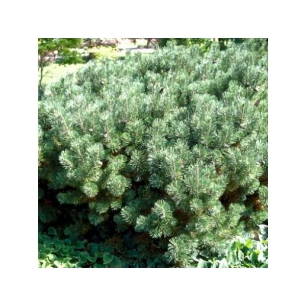 Pinus mugo var. pumilio is een breedgroeiend dwergconifeertje met groene lange naalden en korte donkerbruine kegels.