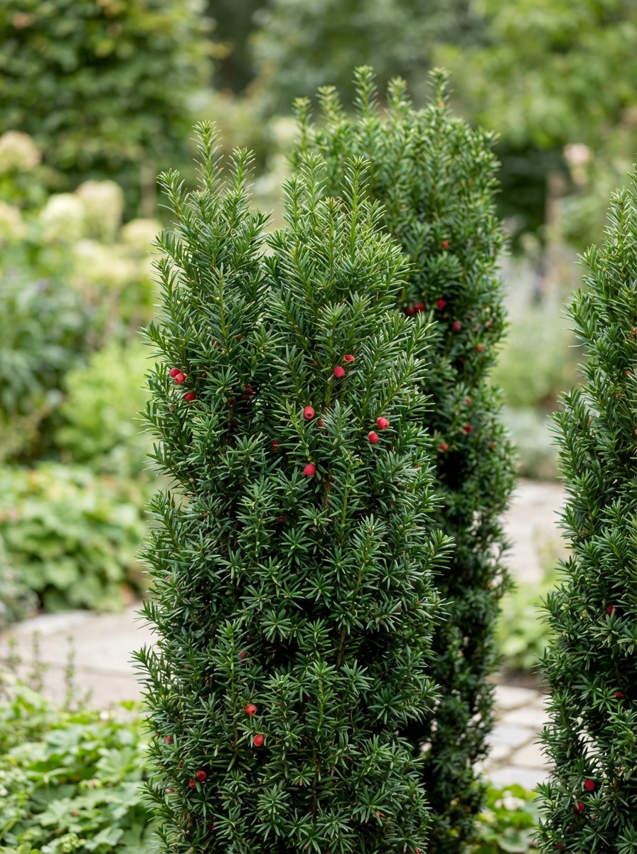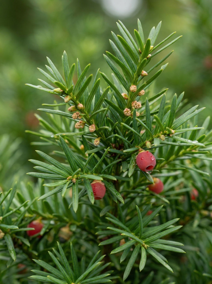 In het najaar verschijnen giftige rode vruchten aan de vrouwelijke 'Hicksii', ‘Hillii’ is de mannelijke vorm.