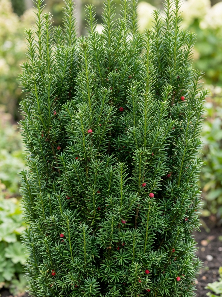 Traaggroeiende, zuilvormige struik met donkergroene naalden.