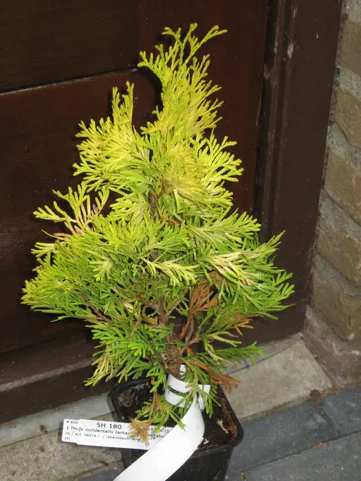 Thuja occidentalis ‘Jantar’ is een piramidale conifeer met bronsgeel blad.