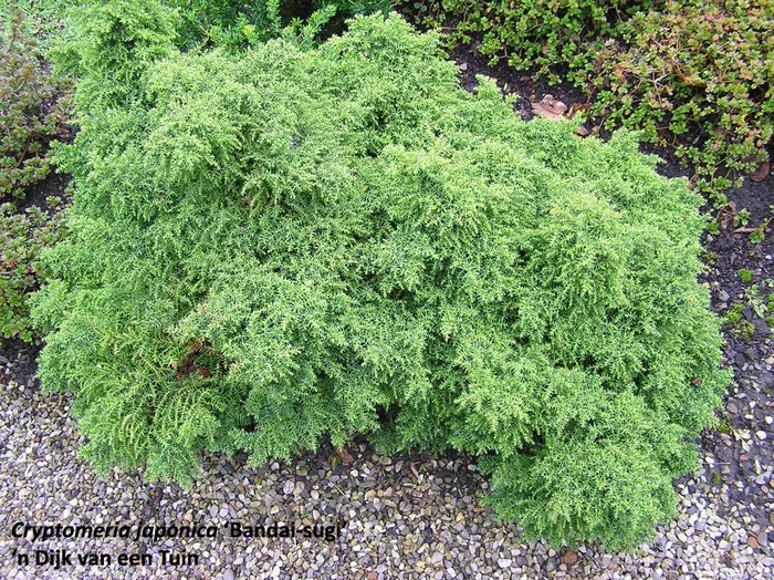 Cryptomeria japonica 'Bandai-sugi' is een langzaam groeiende conifeer met een onregelmatige ronde vorm. Naalden zijn kort en krijgen in de winter een bronsachtige tint.