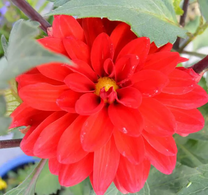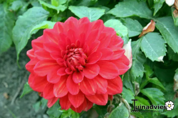 Dahlia 'Heatwave' is een decoratieve dahlia met goed gevulde zuiverrode bloemen en brede platte bloemblaadjes.