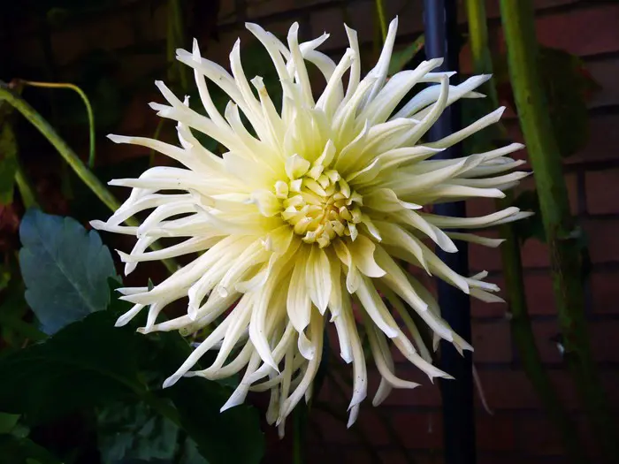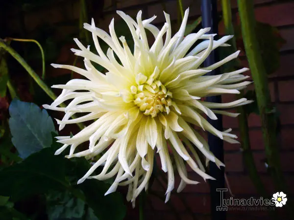 Dahlia 'White Star' is een cactusdahlia (spinnekopdahlia) met goed gevulde grote bloemen. De roomwitte bloemblaadjes zijn bijna volledig opgerold
