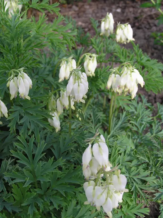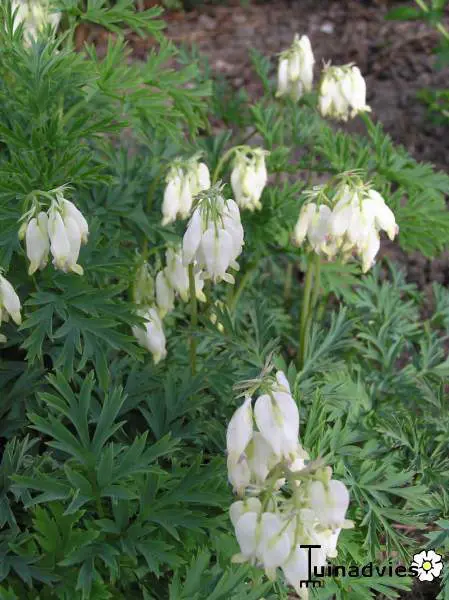 Dicentra 'Ivory Hearts' heeft een varenachtig grijsgroen blad met hangende trosjes van ivoorwitte buisvormige bloemen.