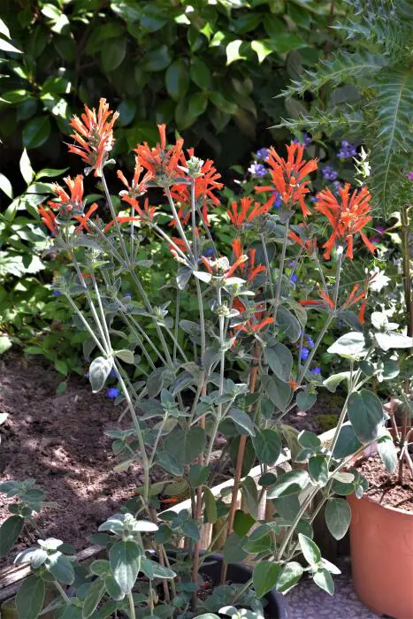 Bloeit met rechtopstaande trossen van buisvormige oranjerode bloemen.