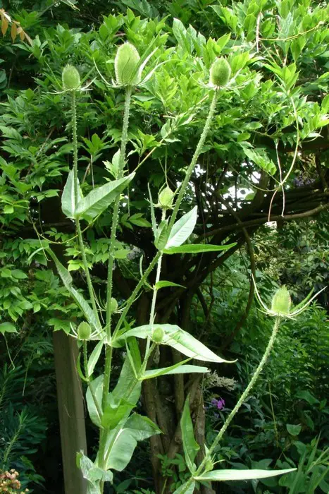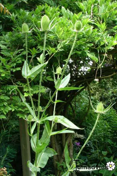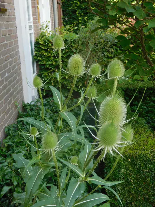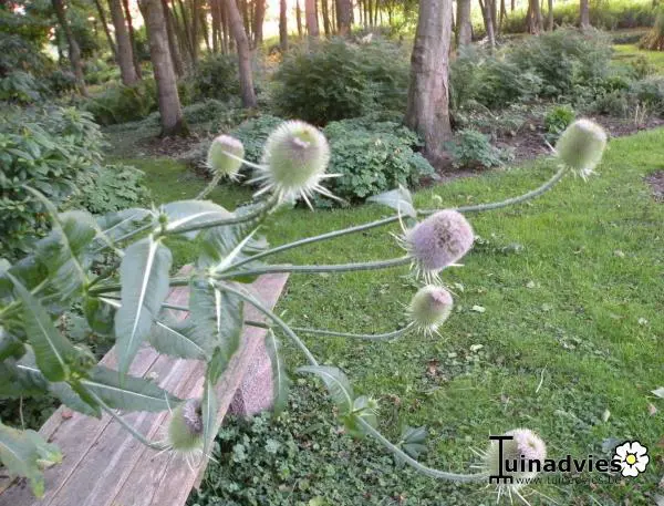 Dipsacus fullonum is tweejarig en zaait zich overvloedig uit. Vogels zijn verzot op de zaden.