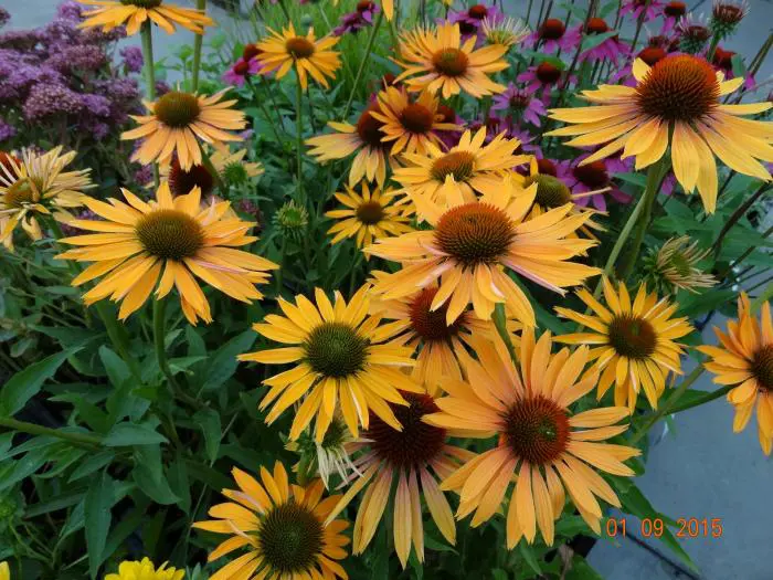 Echinacea purpurea 'Big Kahuna' vormt een stevige plant met honinggele bloemen.
