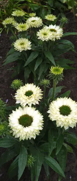 Echinacea SunSeekers 'White Perfection' bloeit met halfgevulde bloemen met limoengetinte roomwitte bloemblaadjes rond een vrij platte, groene kegel in het centrum.